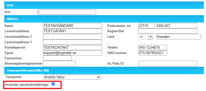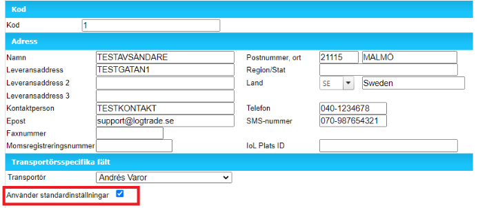 3. I fall det står som i den röda markeringen 'Använder standardinställningar' så har ni inga avsändarmallsspecifika inställningar. Då används istället samma transportörsinställningar för alla avsändarmallar. (Vill ni lägga till avsändarmallsspecifika fält för transportören så hoppa till 5.)