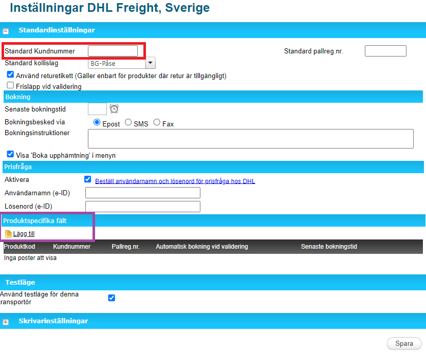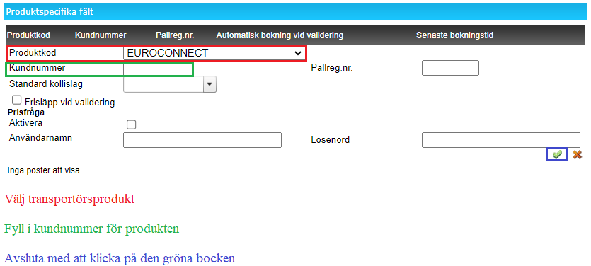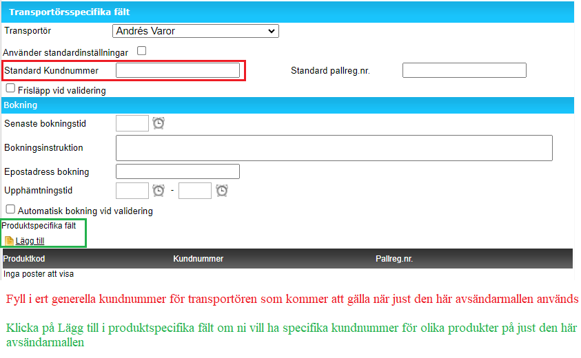 4.1 Det går att lägga in ett generellt kundnummer för alla transportörens produkter i den röda rutan som då kommer vara giltig för alla avsändarmallar på licensens transportörsprodukter.