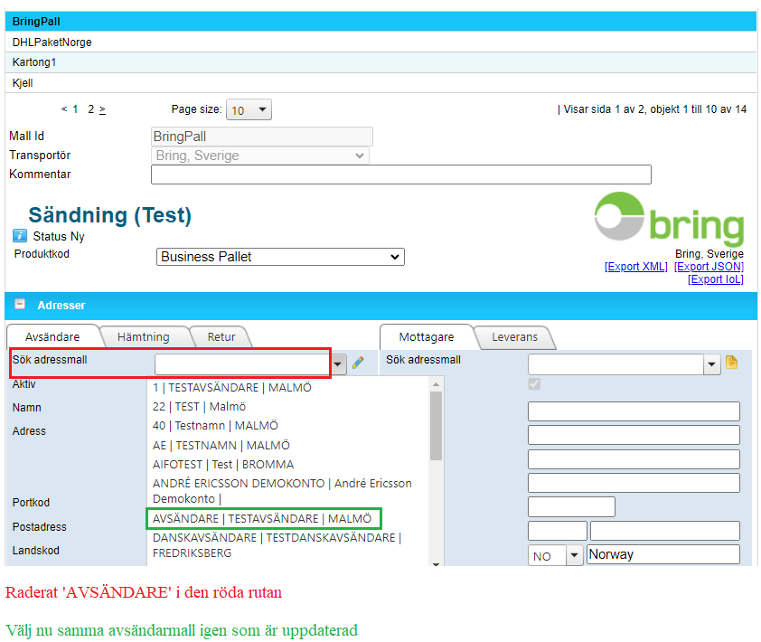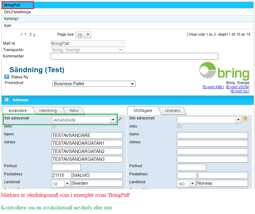 2. Om en avsändarmall används som i exemplet ovan (Grön ruta) så behöver ni uppdatera kundnummer som syns ovan i guiden i steg 5.1.