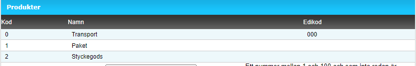 När ni skapar upp en Egen transportör, Europa så ligger det alltid med en produkt med kod 0 som heter Transport som standard. Är ni intresserade av att lägga upp fler produkter så kan ni fylla i nedanstående: