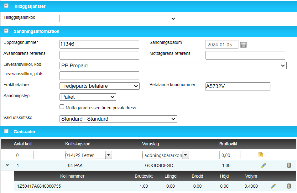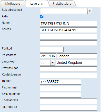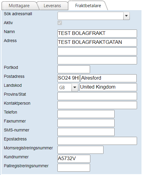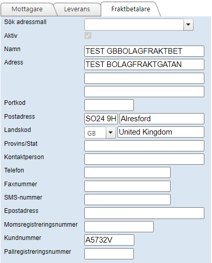 Fraktbetalare : Tredjepart med kundnumret från Storbritannien eller Norge som betalande kundnummer.