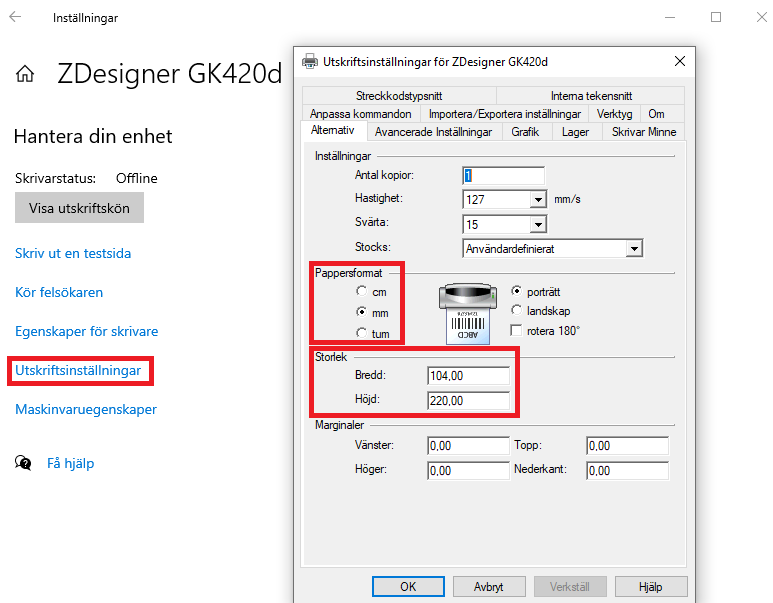 Exempel nedan för Zebra GK420d men kan se annorlunda ut beroende på skrivare.